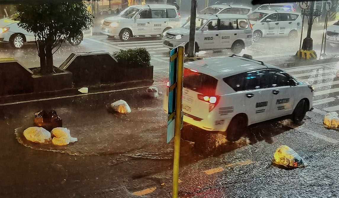 BAGUIO CITY — Heavy downpour caused by Typhoon Kiko at around 10:00pm 4 September 2025 caused raging waters down Session Road to carry bags of garbage to be collected down towards Magsaysay Avenue. photo by Dave Leprozo, Jr.