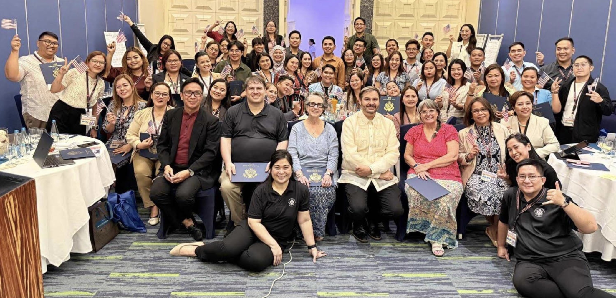 Left: U.S. Embassy Regional English Language Officer Jeff McIlvenna and English Language Fellows Laura Roach, Maryann Miller, and Michael Schapiro (seated) join 48 Filipino teachers at “The Educator’s Edge: Mastering Literacy, AI, and Critical Thought” workshop organized by the U.S. Embassy in Mactan, Cebu, on September 26.