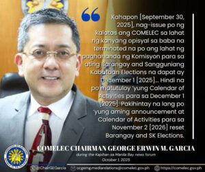 Photos COMELEC suspends preps for Brgy, SK elections By: Cordillera News Agency Date: October 2, 2025 Share post: FacebookTwitterPinterestWhatsApp Previous articleSUSPENSION OF GOVERNMENT WORK IN THE CITY OF BAGUIONext articleHRAB holds Pasta Mania at SM Atrium Cordillera News Agencyhttp://cordilleranewsagency.com I want inI've read and accept the Privacy Policy. Leia C. Margate - October 4, 2025 COMELEC resumes Voter Registration News Palay wholesale prices down in Rizal, Tabuk Business TS Paolo drowns farmlands along Isabela, Cagayan anew Photos A Tour of the Cordillera Weaving Communities, Day 1 Arts & Culture Mental Health experts alarmed in Baguio suicide spike Health Related articles In Medias Res News COMELEC resumes Voter Registration COMELEC resumes Voter Registration By: Nonnette C. Bennett, file photo from City Public Information Office BAGUIO CITY — The... Business Palay wholesale prices down in Rizal, Tabuk Palay wholesale prices down in Rizal, Tabuk By: Dave Leprozo, Jr. Farmers’ Woes. Sundried rice grains along the Rizal,... Photos TS Paolo drowns farmlands along Isabela, Cagayan anew TS Paolo drowns farmlands along Isabela, Cagayan anew Photo by: Dave Leprozo, Jr. Tropical Storm Paolo has driven more problems...