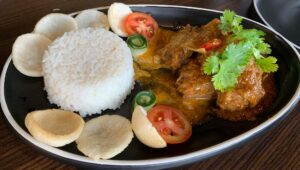 Braised Beef Rendang is a filling meal with deliciously tender beef chunks in coconut milk sauce with turmeric, cardamom, cloves, and nutmeg with rice and crispy besuto prawn crackers.