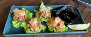 Crunchy Tuna Tartare is raw tuna cubes on a green lettuce leaf atop a crunchy bite sized taco chip. This is topped with thin shaved squid flakes, if my tastebuds are right. Lemon is squeezed on the fish and seasoned with soy sauce; this is a fancy version of sashimi less the wasabi. A perfect match with the salad, the chip gives it a fresh flavor for those who do not relish raw food that much. Perhaps, a request of wasabi could perk this up a little more for those who enjoy sashimi in a different package.