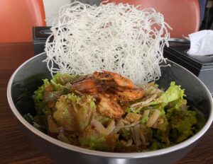 Eunoia Berry Salad has crispy rice noodles in a lettuce based green salad with shrimps, cheese, and peanut brittle with a berry vinaigrette dressing to give it a balance.